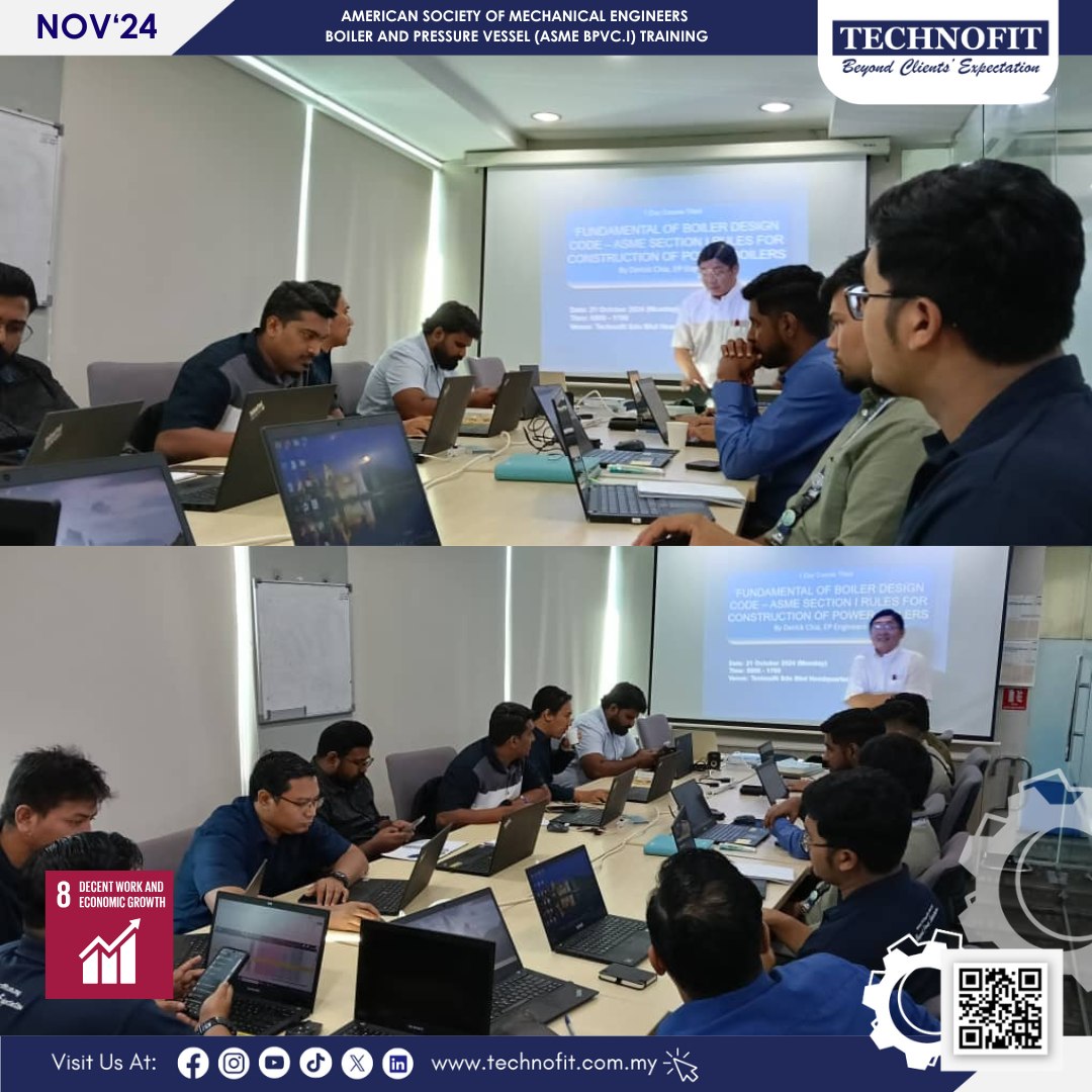 ASME BPVC.1 training is vital across multiple industries, especially in engineering and manufacturing. Through this training, TECHNOFIT hopes to strengthen the expertise of its technical service department in boiler maintenance practices. This approach supports Sustainable Development Goal (SDG) 8 – Decent Work and Economic Growth. TECHNOFIT is committed to fostering sustained, inclusive, and sustainable economic growth, while ensuring full, productive employment and decent work opportunities for all.