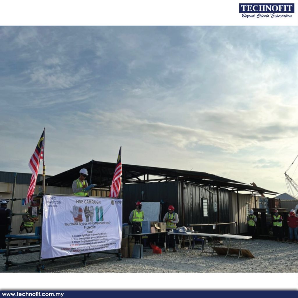 TECHNOFIT Pulau Indah Project’s Health, Safety & Environment Team conducted Hand & Finger Injury Prevention Campaign on 16th August 2022. This effort is in collaboration with PEC Powercon Sdn Bhd to raise awareness on the importance of being equipped with Personal Protective Equipment including proper hand glove usage during work execution.